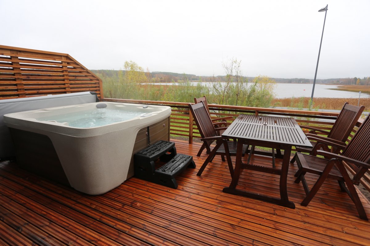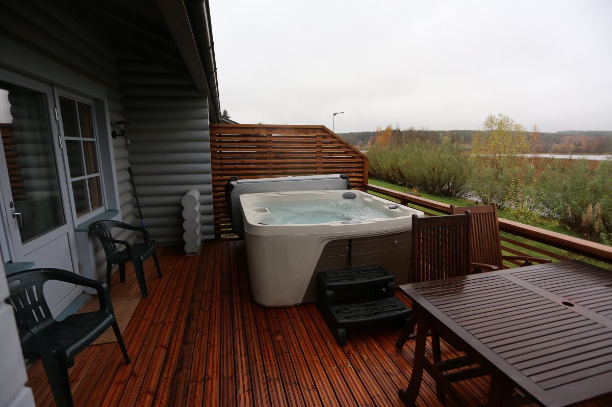 Terassilla on pöytäryhmä ja poreallas. Porealtaan voi vuokrata majoituksen ajaksi lisäpalveluna. Katso tarkemmat tiedot alta, Lisäpalvelut-kohdasta.