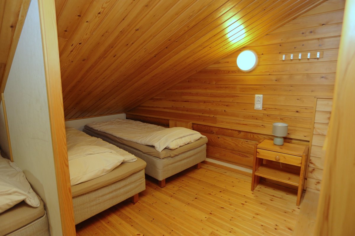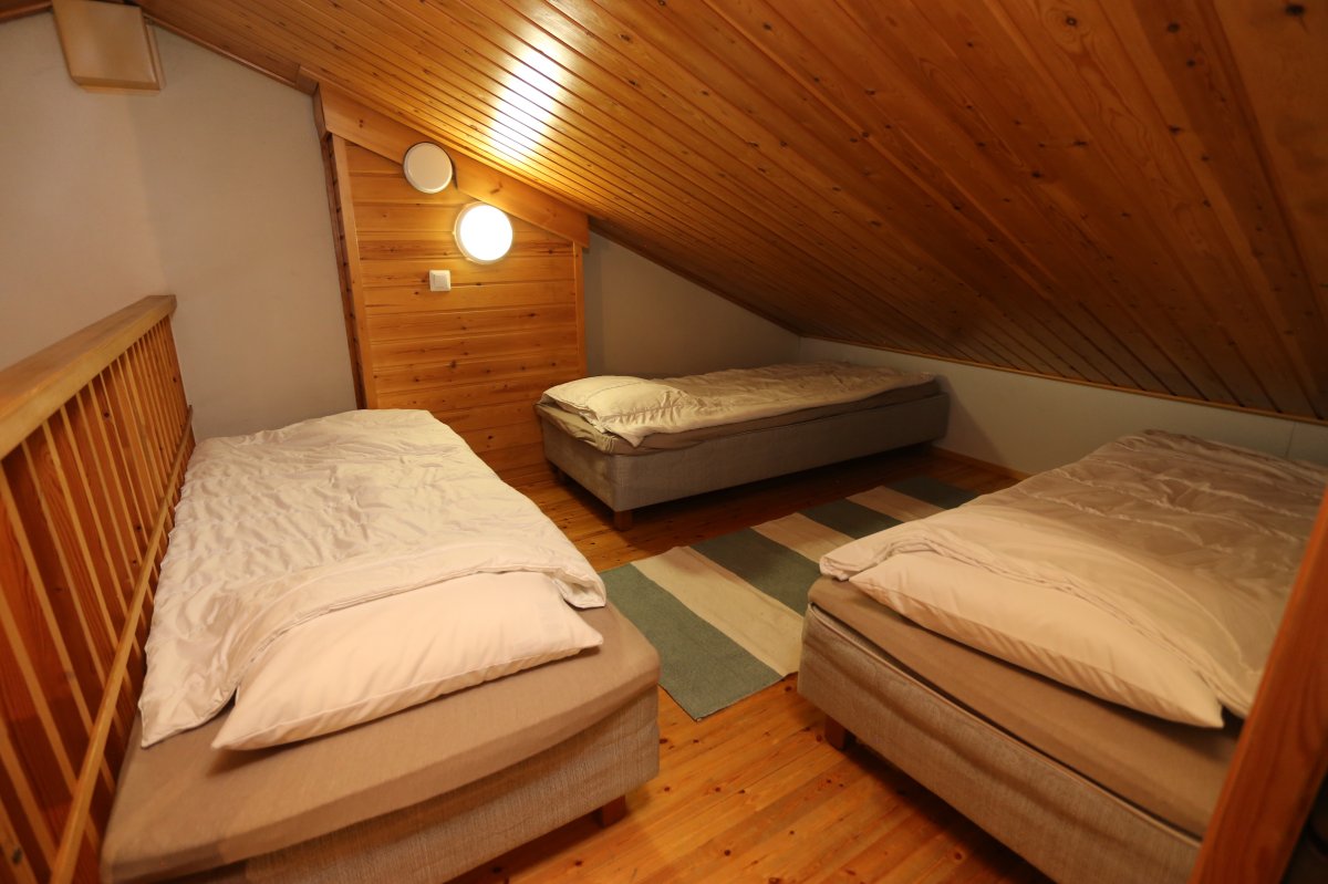 Alakerrassa 1 makuuhuone, jossa on yksi 120cm leveä sänky. Olohuoneessa on vuodesohva.