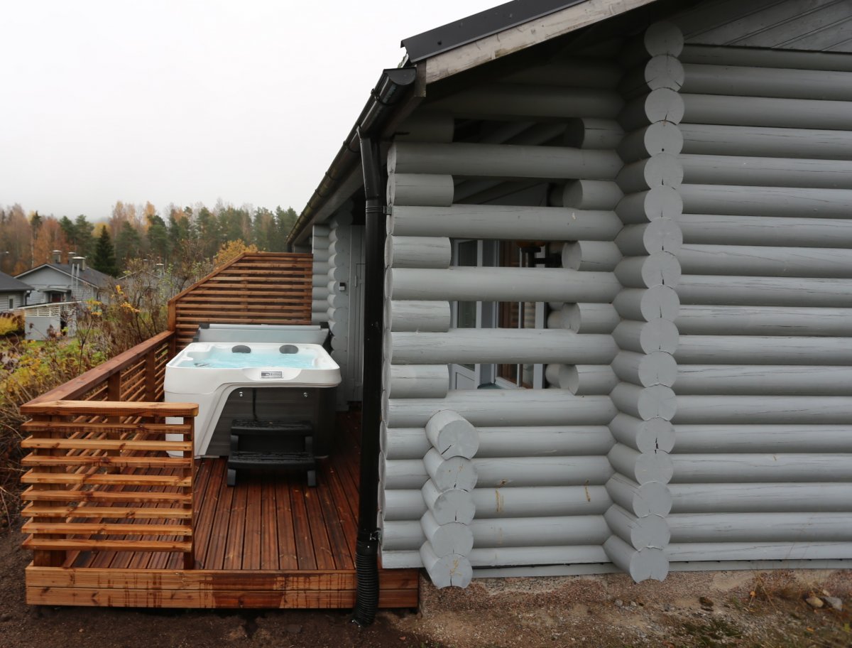 Terassilla on pöytäryhmä ja poreallas. Porealtaan voi vuokrata majoituksen ajaksi lisäpalveluna. Katso tarkemmat tiedot alta, Lisäpalvelut-kohdasta.