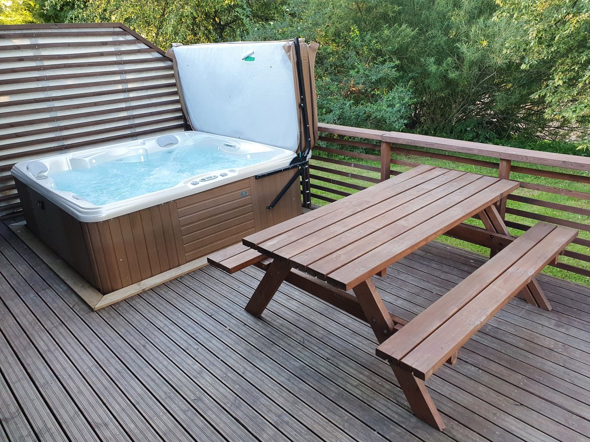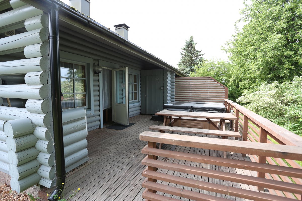 Terassilla on pöytäryhmä ja poreallas. Porealtaan voi vuokrata majoituksen ajaksi lisäpalveluna. Katso tarkemmat tiedot alta, Lisäpalvelut-kohdasta.